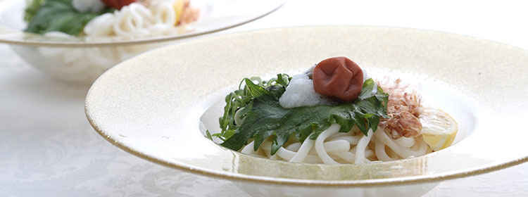 グリッターカラーが目にも鮮やかな「ヴェトロ フェリーチェ」。縁がついたリムボウルは、冷製パスタや冷やしうどんなど、清涼感に溢れ夏の食卓にぴったり。梅干しや紫蘇など、香味野菜の彩りが美しく引き立ちます。