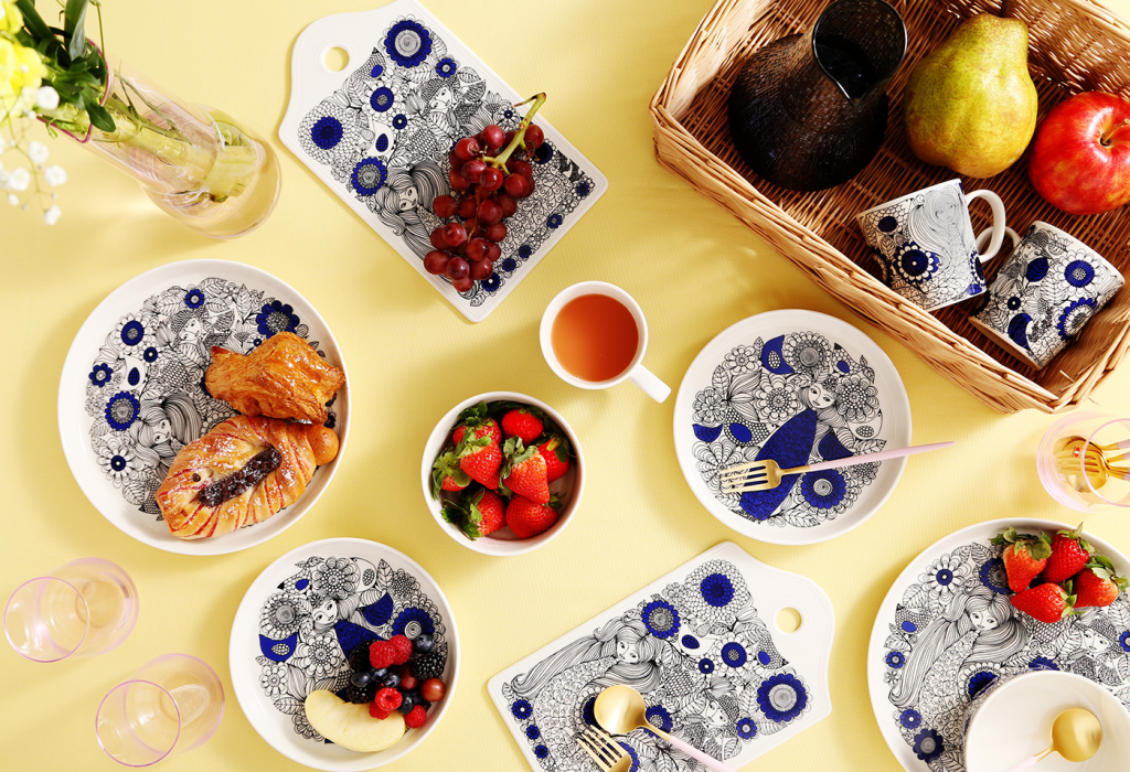 Pastoraali(パストラーリ)をデザインしたエステリ・トムラ(1920-1998)は、アラビアの最も重要な装飾デザイナーの1人です。1960年代後半から製作されたパストラーリ(牧歌の意)は、オフホワイトの素地に墨色の線描きとブルーの着色、流し目の美女が印象的なシリーズです。デザインモチーフは、2~3世紀頃ロンゴスというギリシャ人によって書かれた若い二人が主人公のラブストーリー「ダフニスとクロエ」です。