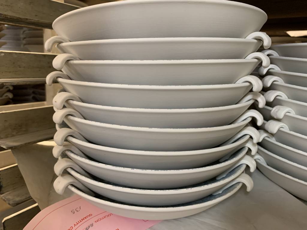 釉薬をかけた器は、サガーの中で器同士がくっつかないように間に小さな部品を挟んで支えます。カップやプレートの裏を見ると3つほど釉薬のかかっていない点がついていることがありますが、これは不良品ではなく、この小さな部品の跡なのです。