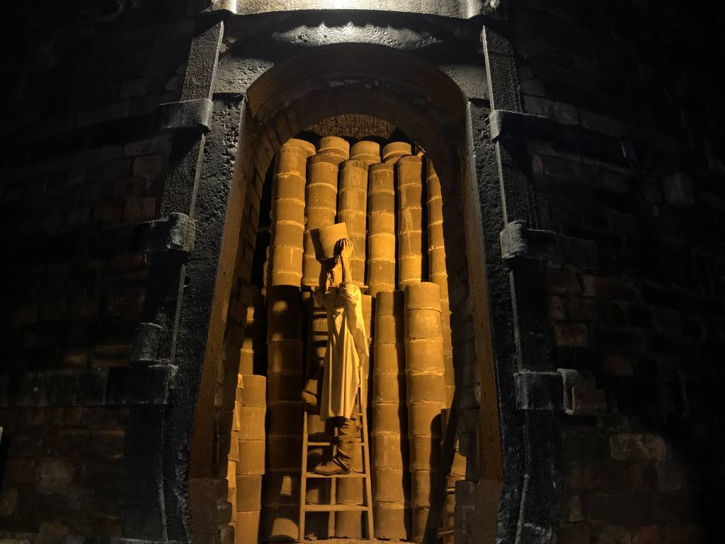 こちらの写真は昔のボトルオーブンが使われていた時代を再現したものです。ボトルオーブンで焼くときは、サガー(Saggar)という陶器の入れ物に入れて焼きました。サガーは器を支え、また煙や煤から器を守ります。サガーの中には器を何枚も入れるため、重量が25kgにもなったそうです。これをボトルオーブンのなかに一つ一つ積んでいきました。