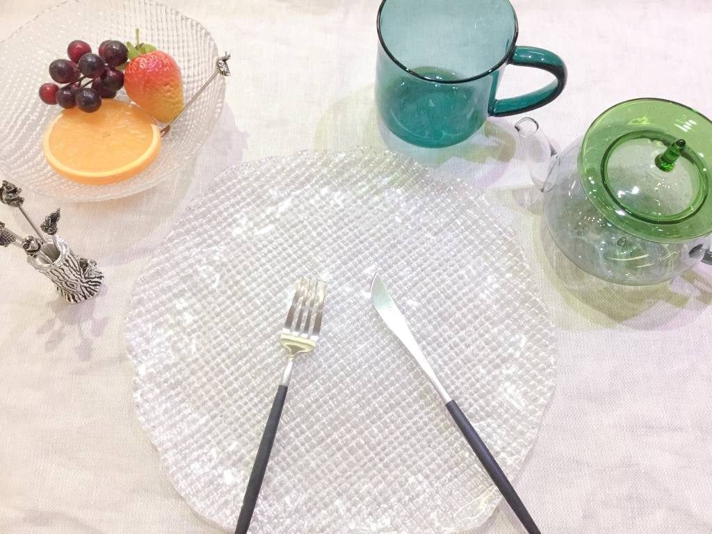 中央にホットケーキとシロップ、少し小ぶりなイッケンドルフのガラスのおしゃれなポットでいろんな紅茶を何度も入れて楽しみたいな…と想像が膨らみます ⚘ VIVAのカップがポットに対して少し大きいのはご愛嬌。この色が涼し気で綺麗で使いたいので良しとします。笑 ガラスのプレートとボウルはル・ノーブルオリジナルのフィズシリーズのもの。シンプルで合わせやすいのはもちろん、ガラスを回転させて制作されているため、縁取りがランダムに波打っているのも味があって面白いです。