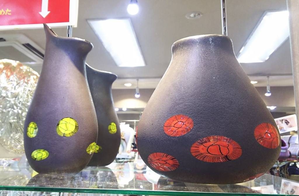 富嶽三十六景や東海道五十三次をガレと同じ技法で描いたこんな花瓶もありますよ。