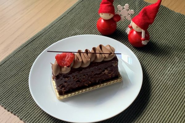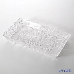 クリスマスに食べられる、丸太の形をしたケーキのブッシュドノエル。ロールケーキの上にクリームを塗って、木目の模様を付けます。長方形のお皿は、ロールケーキを置くのにちょうどいいサイズ。豪華なカットのボヘミア製ガラスのお皿は、盛り付けるだけで華やかな雰囲気になります。