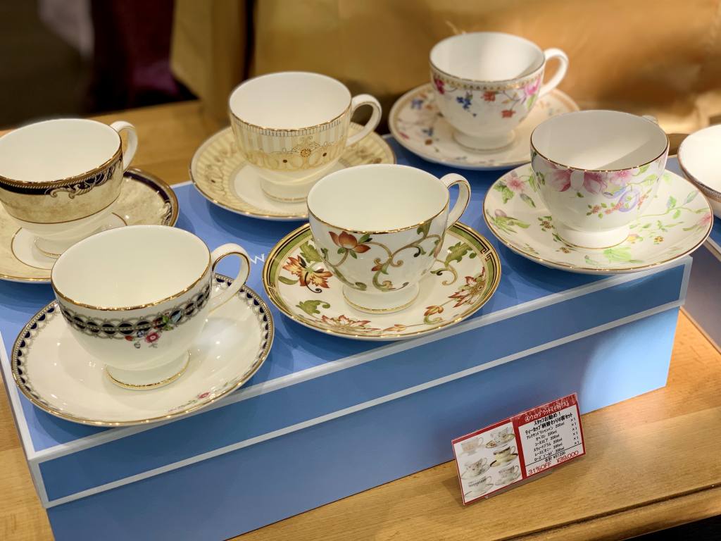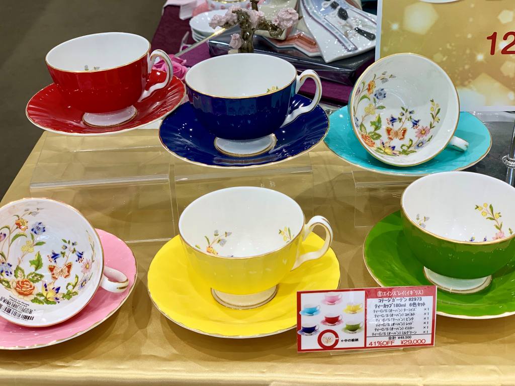 ↓ エインズレイの“コテージガーデン”6客セットは、華やかながら和柄っぽい柄が内側に描かれており、昔からの人気シリーズです。