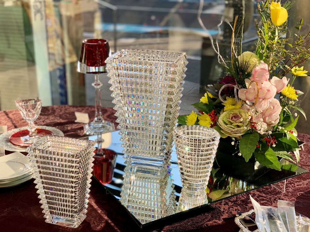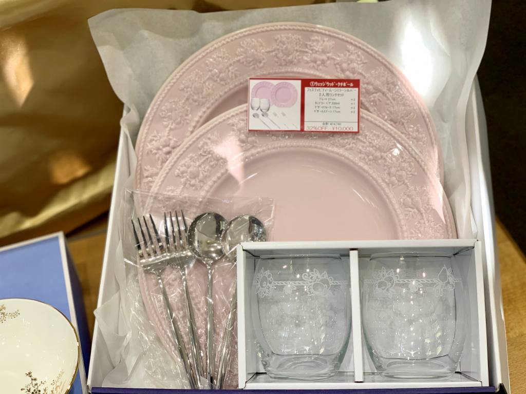 ↓ ウェッジウッドのフェスティビティピンク27㎝とペアグラス、クチポールのムーンシリーズ。