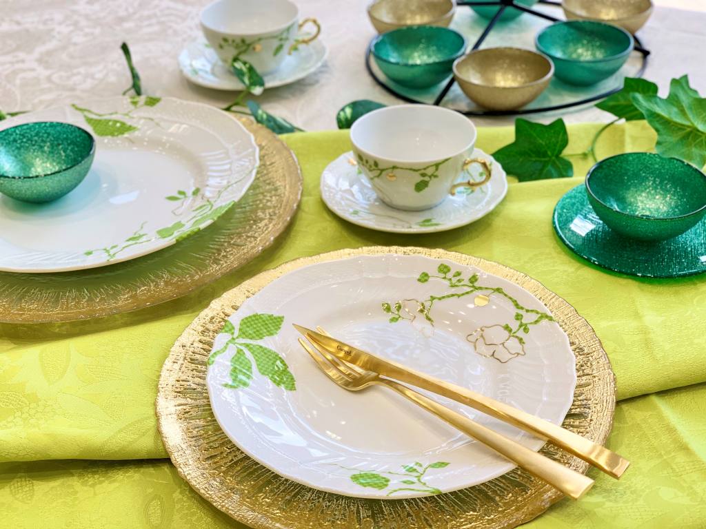 ベッキオホワイトとのコーディネイトの相性もよい「フィオーリ ヴェルディ(緑の花)」は、料理を盛ったときに完成する絶妙なバランスの上品な器です。