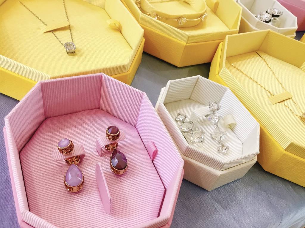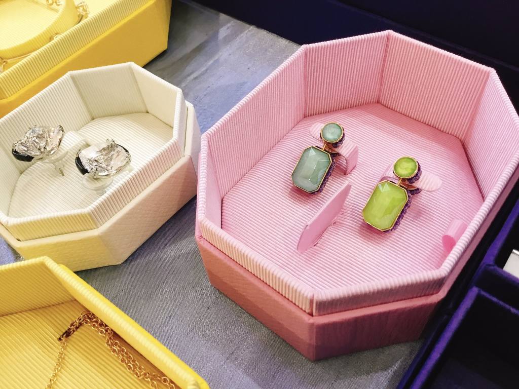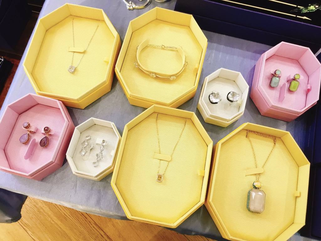 宝石ではないけれど、クリスタルガラスの美しさやカラーを活かしたデザインでかなり素敵です。そして今回入荷した新作のアクセサリーは、新デザインのBOXで入荷しています。ブルーのイメージから一転、ピンクやイエローのBOXはおしゃれでギフトにも喜ばれそうです☺