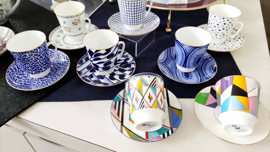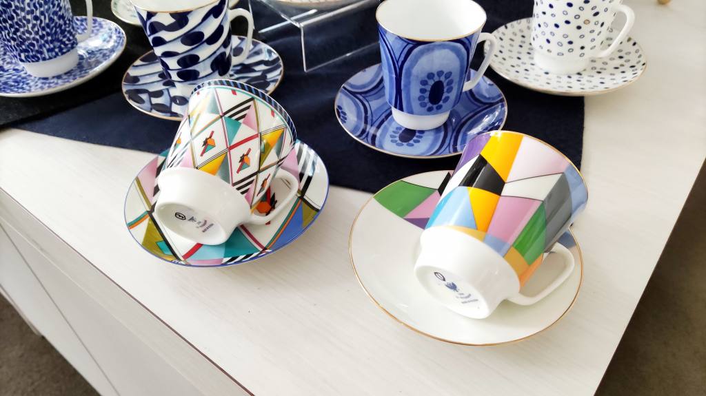 白くてきらめくボーンチャイナの素地に、抽象的かつ幾何学的な模様がカラフルに描かれており、それぞれのパーツが調和して心躍るリズム感を感じさせてくれます。