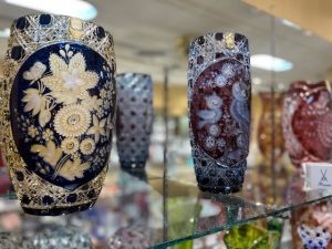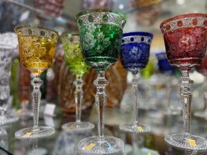 京都四条店の店頭で 色鮮やかなマイセンクリスタルをどうぞご覧ください。