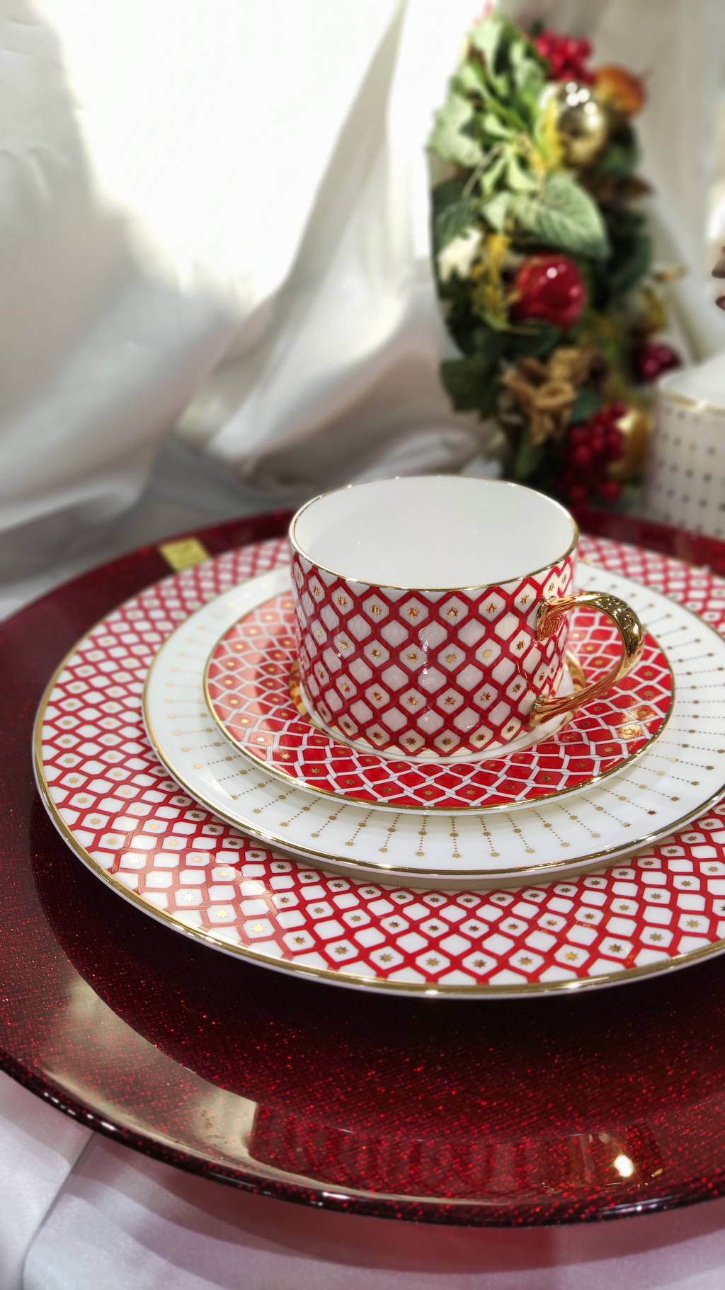 インペリアル・ポーセリンの代名詞といえるコバルトネットパターンにインスピレーションを受けた幾何学模様の中に整然と配置された星が、シンプルかつ洗練された印象を与え、また鮮やかな赤と白の配色は様々なシーンでのお祝いムードをより一層高めてくれます。