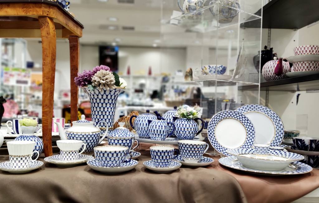 コバルトの網目模様に金の美しい装飾が特徴の「コバルトネット」シリーズは、女帝エカテリーナ2世に献上されたディナーセットを基に制作されました。