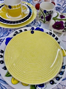 ブルーやパープルの柄と合わせると、ますます北欧らしい賑やかなテーブルに。