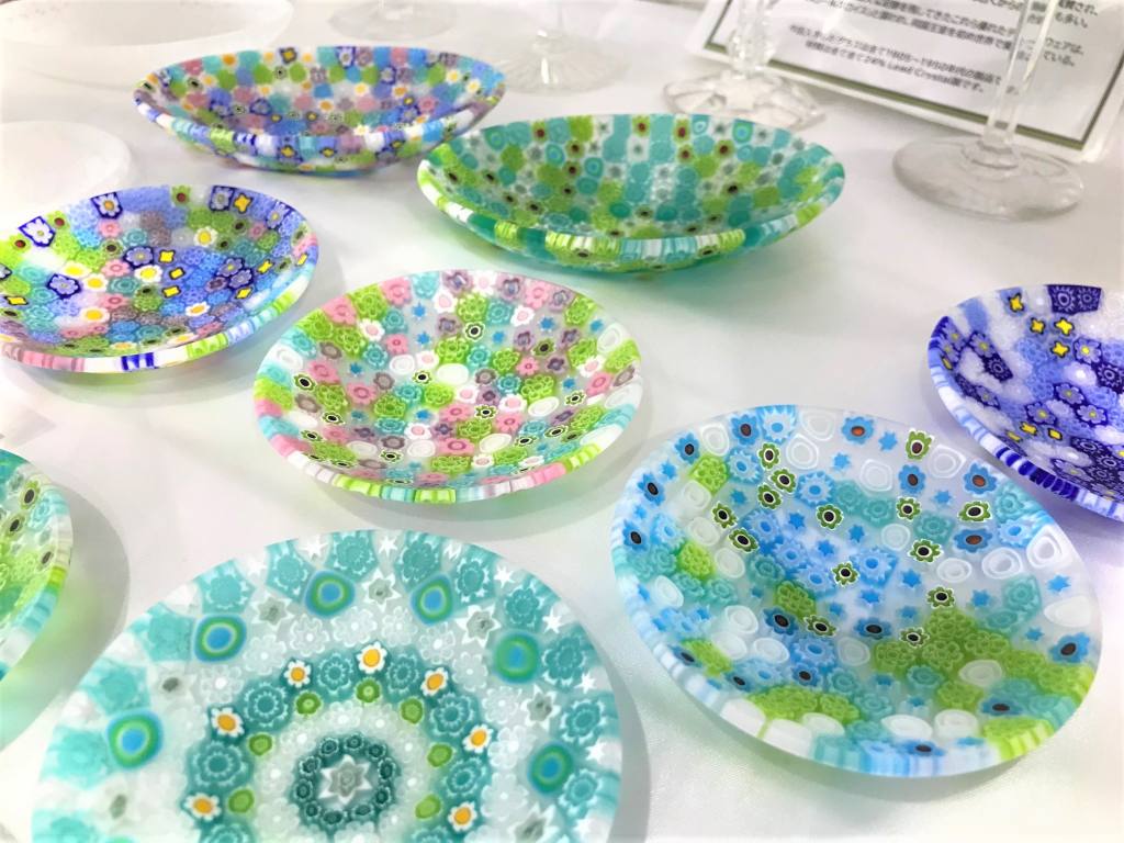 模様を構成する小片は、色のガラスを幾重にも重ね合わせ、熱いうちに長く細く伸ばしたガラス棒を薄く切断すると、金太郎飴のように断面に模様が現れます。