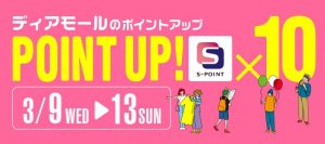 3/9㈬~3/13㈰の期間中、Sマーク付きカードをお買い物時にご提示いただくとお買い上げ付与ポイントを通常の10倍(通常1%分→10%分)進呈いたします。