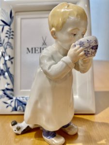 マイセンの代表作ブルーオニオンの柄なのです。身長約17㎝の男の子が