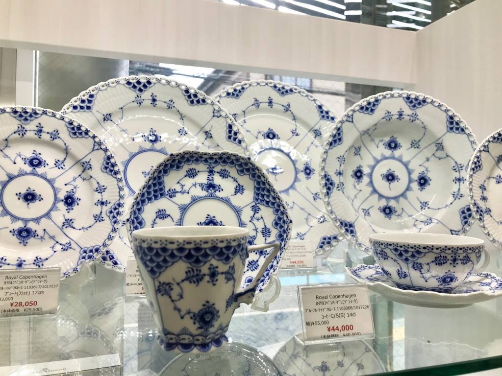 美しいブルーの装飾は手描きにて施され、さらに独自の特徴として、エレガントなレースの縁取りが地模様とマッチして華やかさを加えています。