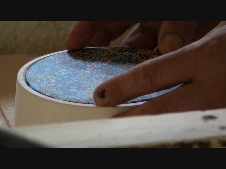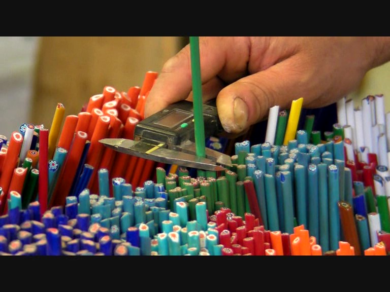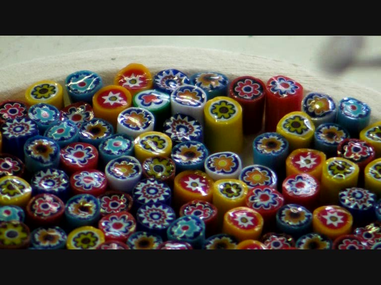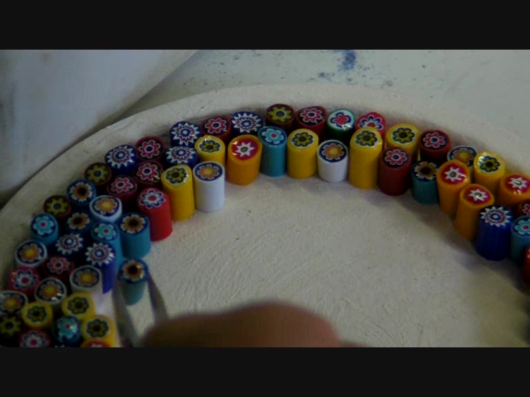 ミルフィオリのガラス棒は横から見ると単色(または縞模様)のガラス棒にしか見えないため、数ミリの厚さに切断し、断面を見せてアクセサリーやガラス器に埋め込んで使用します。