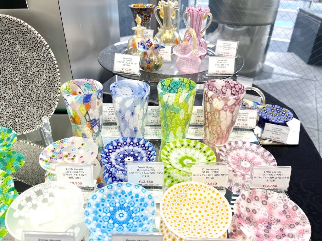 ミレフィオーリ(千の花)とよばれるモザイク柄と、ひとつひとつ宙吹き(鉄のパイプから息を吹いてふくらませる技法)された小さな香水瓶などを得意としています。
