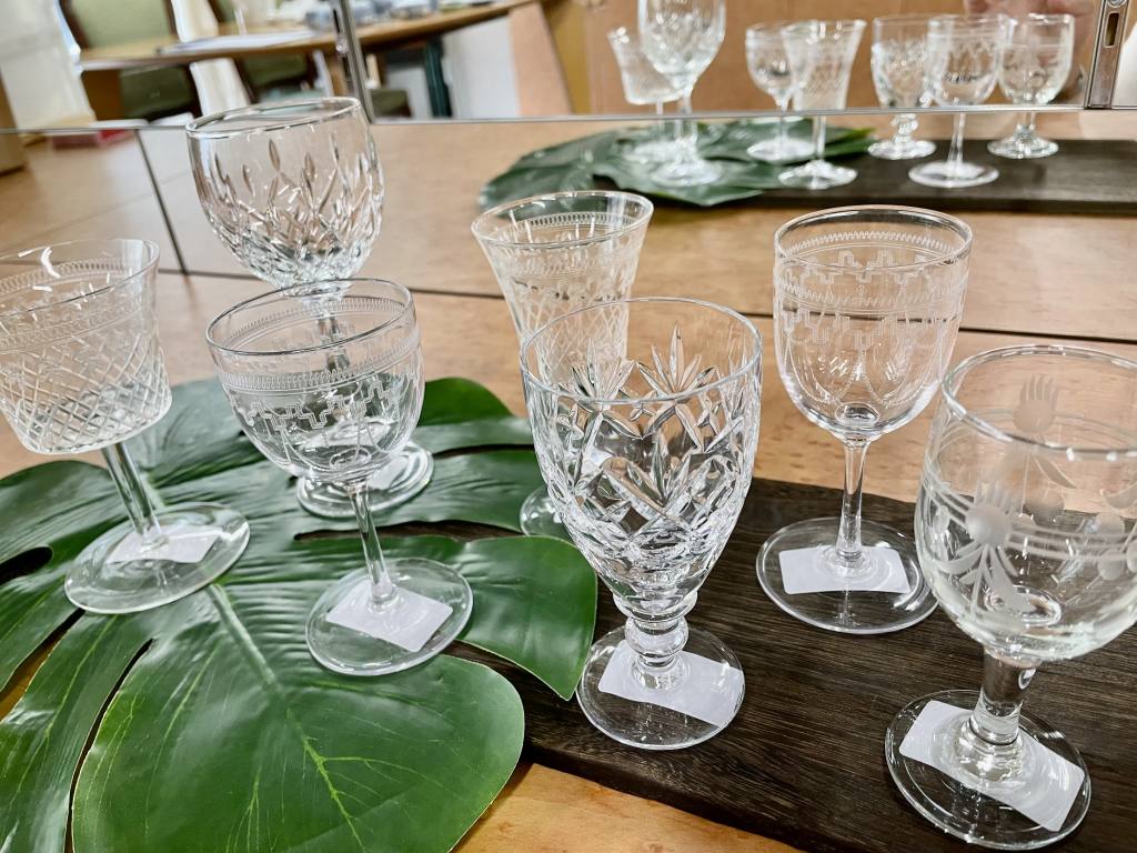 現代ではあまり見かけなくなったカッティング、エッチングなどが施されたリキュールグラス。