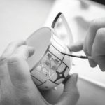 それぞれの作品の柄は意図的に中心からずれていたり、またティーカップやマグカップの底面にこっそり模様が隠れていたりと、ユニークな遊びごころがたまりません。