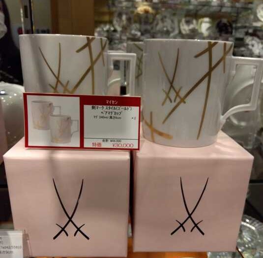 ↓マイセン・剣マークがゴールドおしゃれにデザインされたのマグカップをペアで。