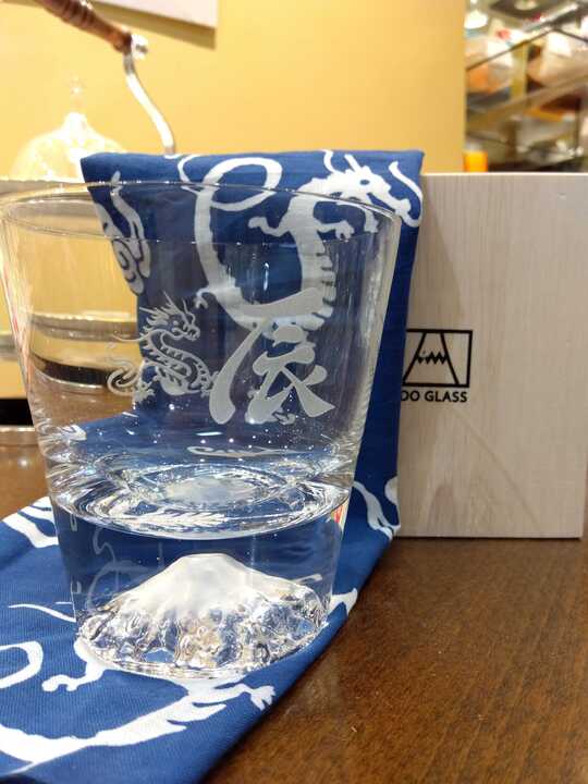 大人気の富士山グラスに来年の干支「辰」がエッチングされています。