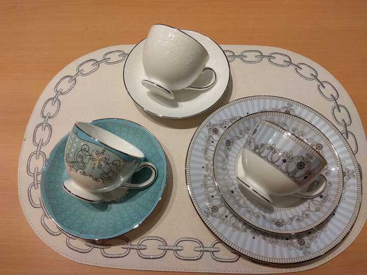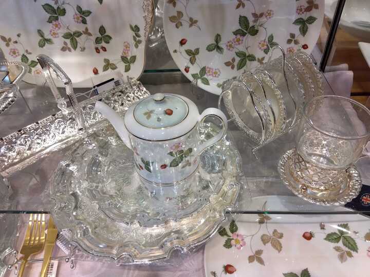 高価な食器やカップを引き立ててくれ、トレイや食卓周りの色々なテーブル小物があります。
