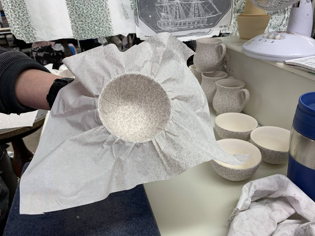 デザインが印刷された転写紙は、素焼きした器に一枚一枚手で貼り付けます。 丸い器に平面の図案を張り付けるのは、とてもとても丁寧な作業が必要です。