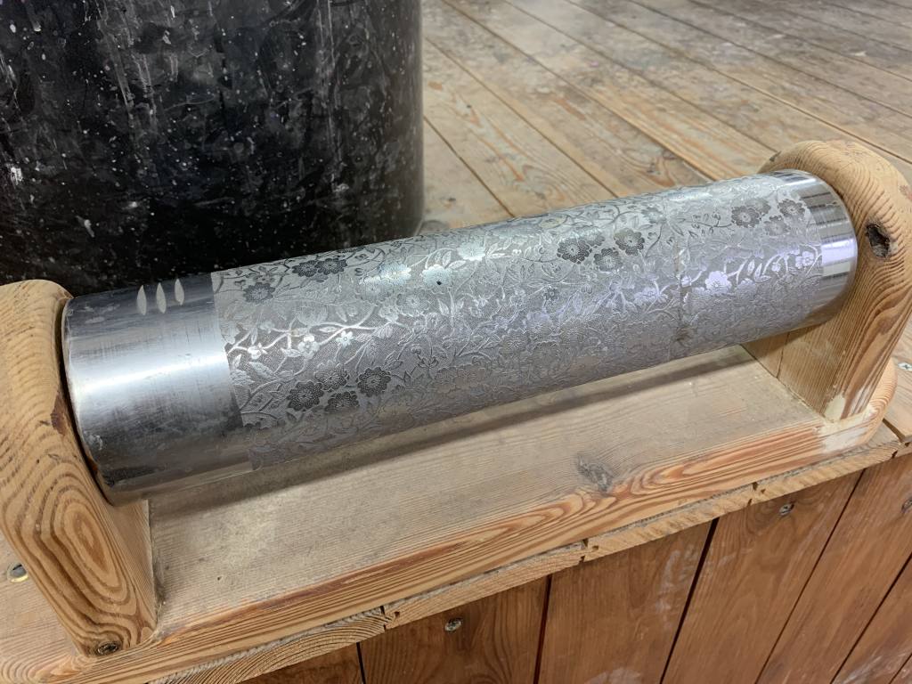 この円筒形の銅板で転写紙に柄を1枚1枚印刷します