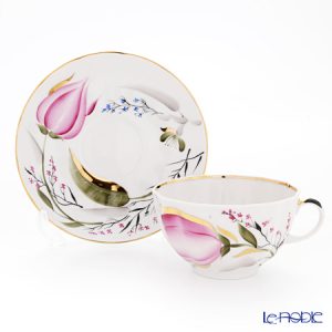 淡いピンク色のチューリップがカップとソーサーに大胆に描かれています。