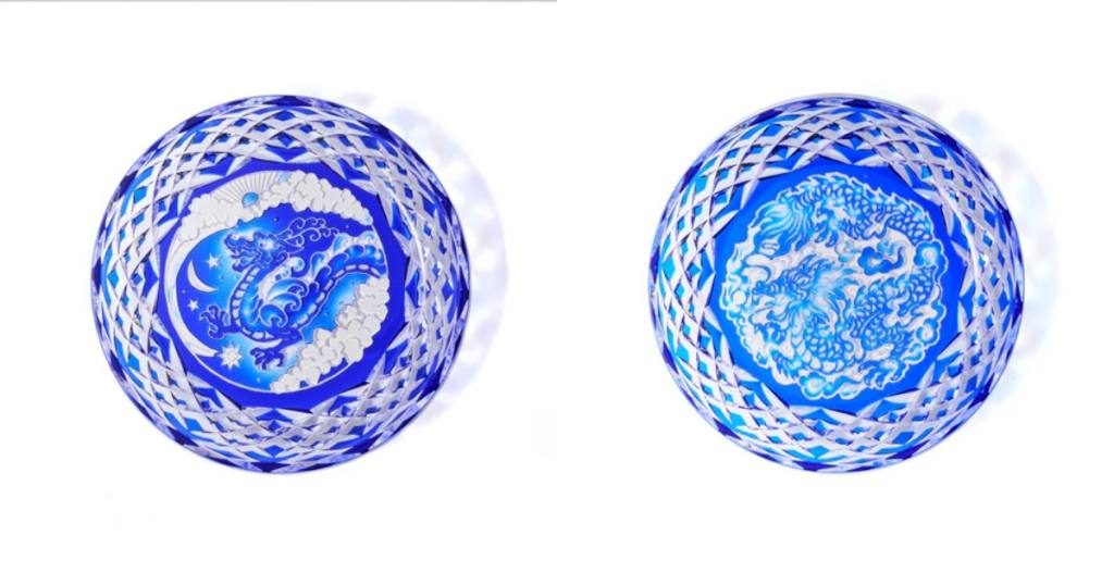 (左)江戸切子 2024年イヤーズプレート「天空」税込価格33,000円 (右)江戸切子 2024年イヤーズプレート 「玉追」ルリ 税込価格33,000円