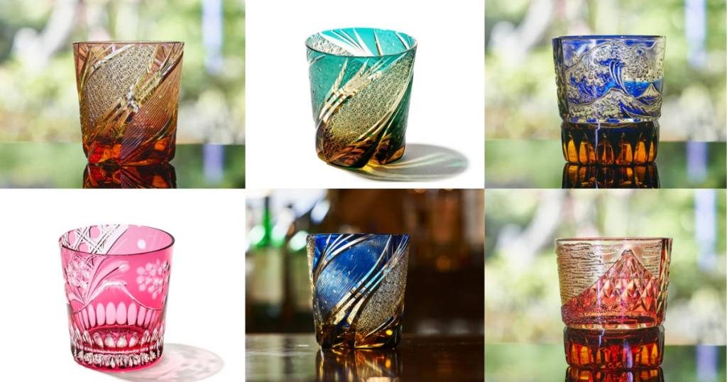 (左上)江戸切子 流星 オールドグラス 琥珀金赤 税込価格55,000円 (中央上)江戸切子 流星 オールドグラス 琥珀緑 税込価格55,000円 (右上)江戸切子 伝統工芸士 木村泰典 作 富嶽三十六景「神奈川沖波裏」に菊籠目紋 オールドグラス 琥珀ルリ 税込価格82,500円(左下)江戸切子 富士桜に籠目紋 オールドグラス 金赤 税込価格36,300円 (中央下)江戸切子 流星 オールドグラス 琥珀ルリ 税込価格55,000円 (右下)江戸切子 伝統工芸士 木村泰典 作 富嶽三十六景「凱風快晴」に菊籠目紋 オールドグラス 琥珀金赤 税込価格82,500円