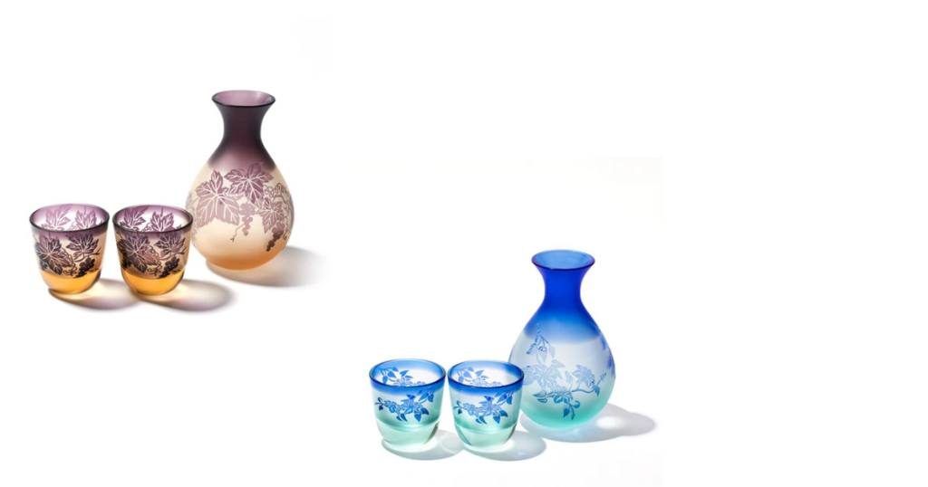 (左)彫刻 夢柄子 ぶどう紋 酒器三点揃 アンバー/パープル 盃55ml 徳利210ml 税込価格13,200円(右)彫刻 夢柄子 鉄線紋 酒器三点揃 グリーン/ブルー 盃55ml 徳利210ml 税込価格13,200円