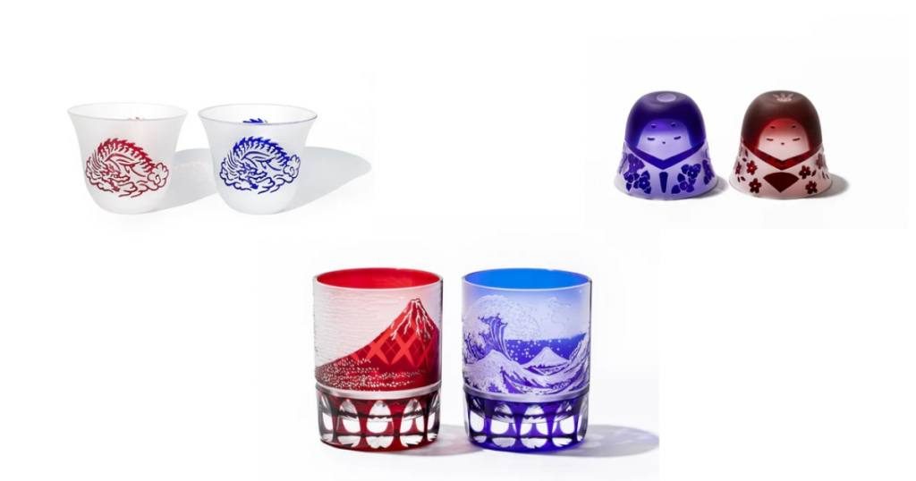 (右)彫刻 夢柄子 干支「辰」ぐい呑ペア 税込価格5,500円 (中央)江戸切子 赤富士・波富士に矢来紋 オールドグラスペア 赤・ルリ 税込価格28,600円(左)彫刻 夢柄子 ひな盃 ぐい呑ペア 税込価格6,600円