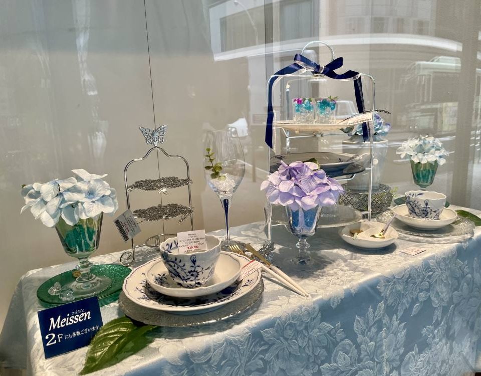 四条店のウィンドウは、少しでも目に涼しく感じてもらうため藍&白に紫陽花をあしらっています。