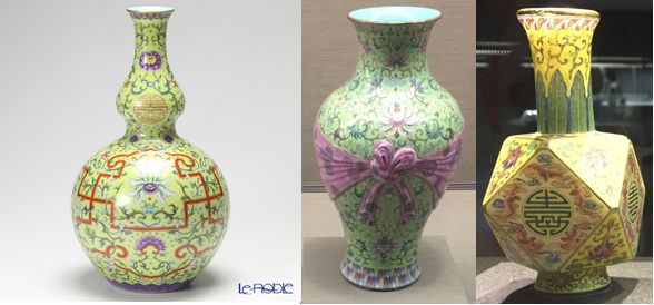 粉彩:色付きのものを集めました。左画像と右画像に書かれている丸い文字は「寿」。真ん中画像はリボンが結ばれている珍しいデザイン。ちなみに右画像のベースはガラス製、口元がライトで透けて色がより一層鮮やかに。
