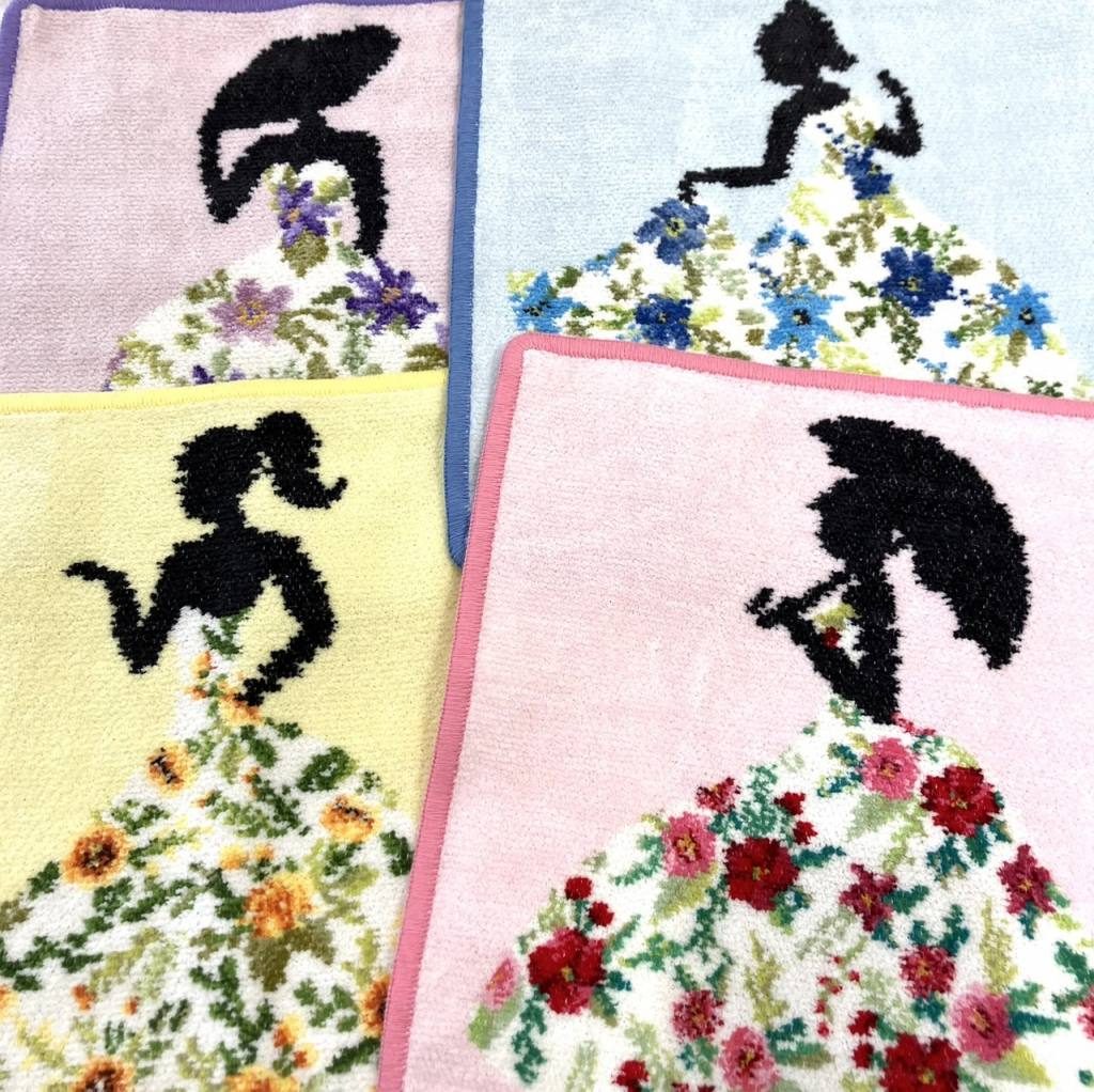 ハンドタオル ミスフラワー25x25cm ((上から時計回りで) ブルー / ピンク / イエロー / ライラック) 【各2.200円 (税込)】