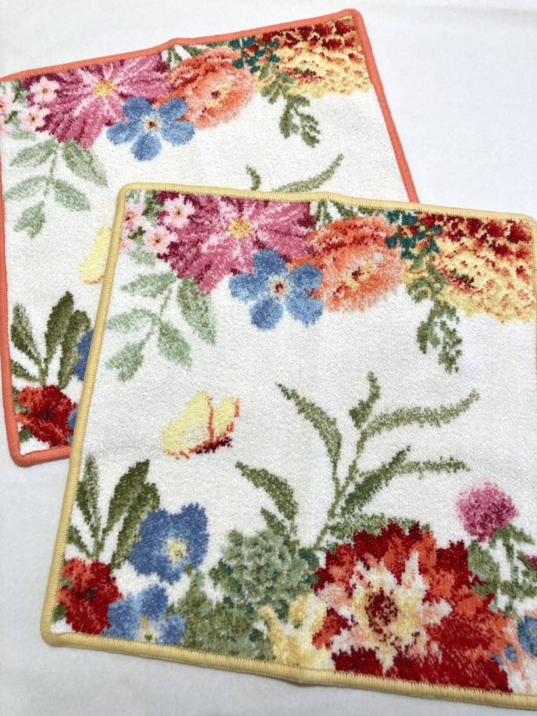 (手前から) ハンドタオル ディアンドルローズ ピンク 25x25cm / モンプティ アクア 25x25cm / レインボウ ブロッサム 25x25cm【各2.200円 (税込)】