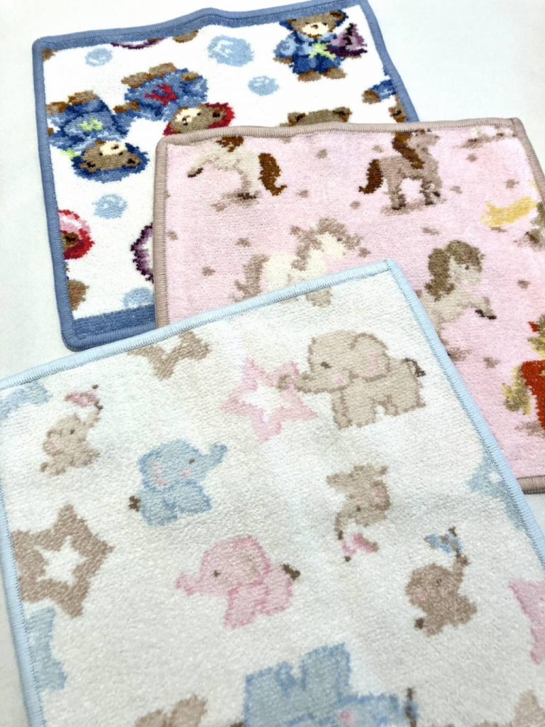 (手前から) ハンドタオル エレファント ブルー 25x25cm / ハッピーポニー ピンクベージュ 25x25cm / リトルスキッパーズ ライトブルー 25x25cm 【各2.200円 (税込)】