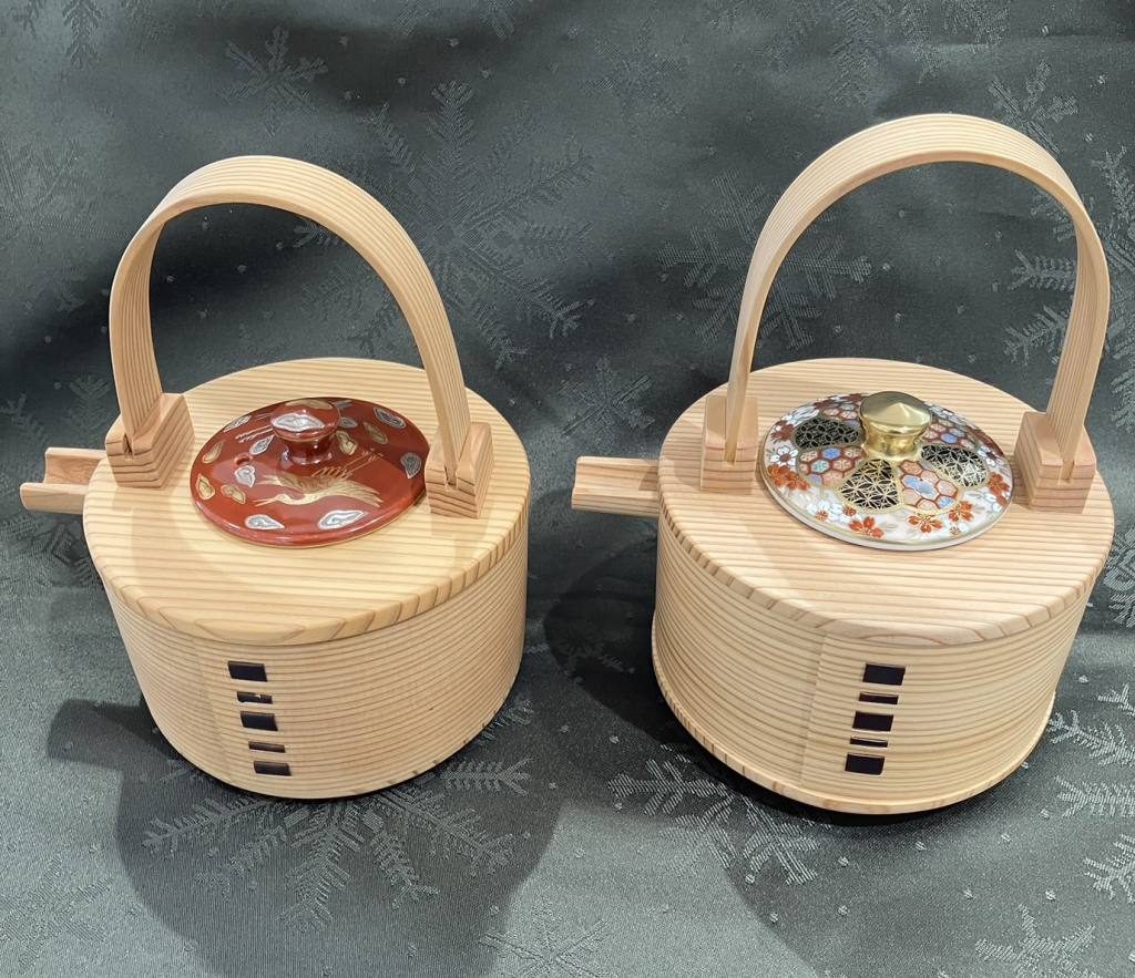 酒器 T09107 曲げわっぱ 赤蒔金銀鶴 600ml【55000円 (税込) 】 / 酒器 T09140 曲げわっぱ 渕花小紋 600ml【77000円 (税込) 】