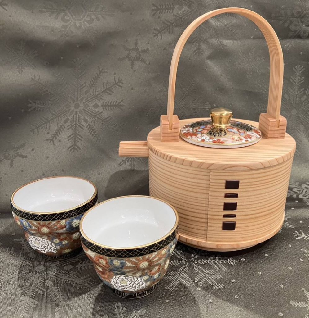 こちらは、秋田杉の流れるような木目が美しい曲げわっぱ × 清水焼 で個性光る酒器となります。