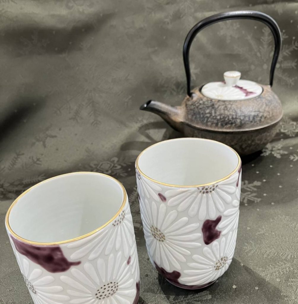 鉄瓶急須・黒 K0121 白菊紫地 500ml【33000円 (税込) 】 / 湯呑 K0417 白菊紫地【単品 8800円 (税込) 】