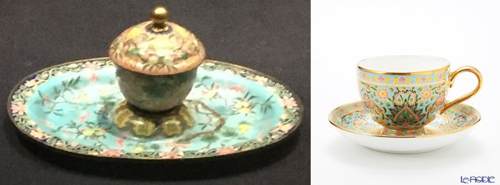 有線七宝とタイのベンジャロン焼のカップ&ソーサー。鮮やかな色彩と細かい模様でとても華やかです。