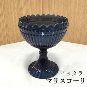 長年製造され、様々なカラーが生み出されたマリスコーリ。上部のフリルが愛らしく、飾るだけでも可愛く、フルーツを乗せたり、お花を生けても可愛いですね。今回はダークブルーの色味のみ入手できました。