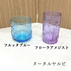 両方とも現行商品を多数手がけたデザイナーOiva Toikkaの作品です。マウスブロー製法で作られており、ひとつひとつガラスの厚みが違うのも魅力的です。現行のフルッタと一緒に使用しても可愛いですね。