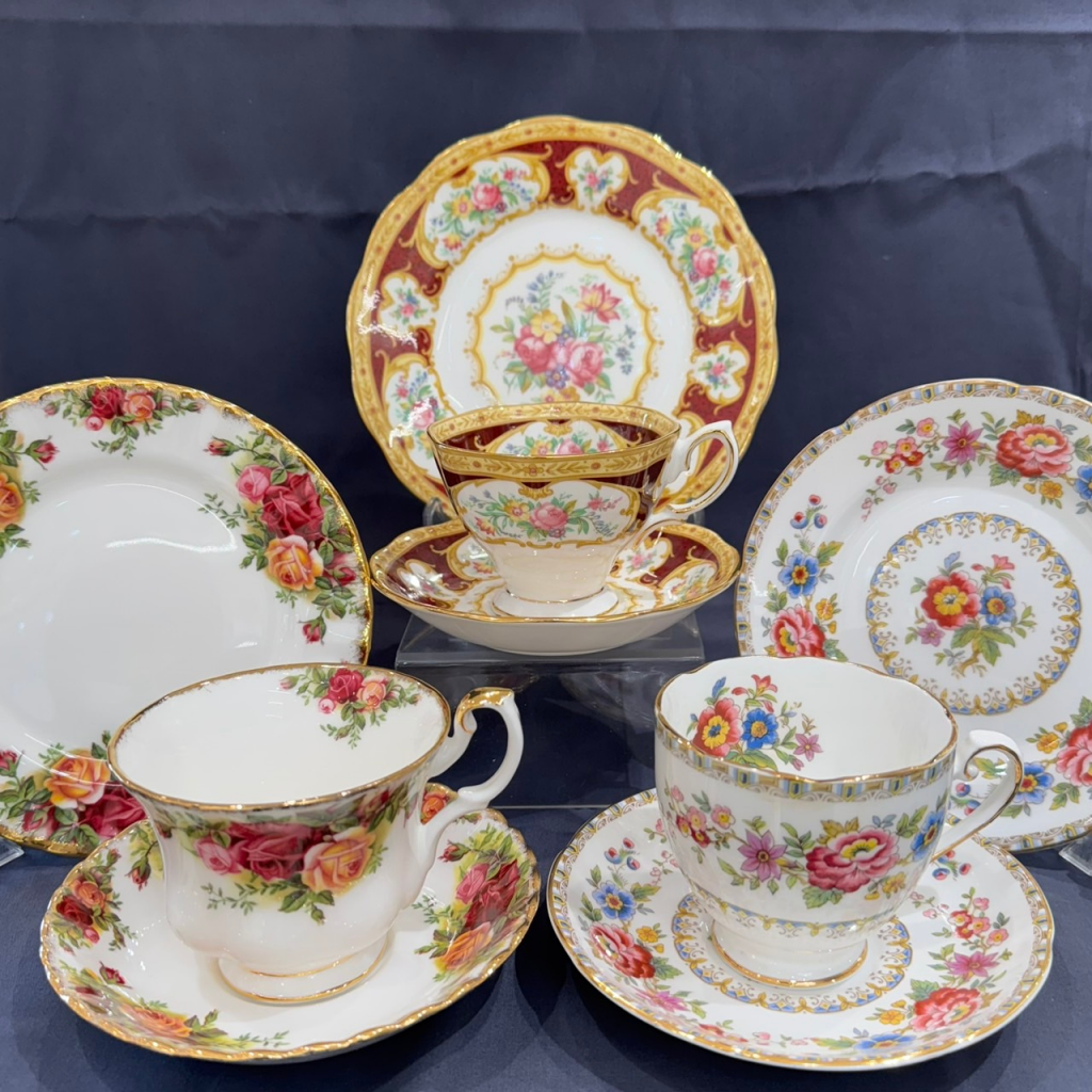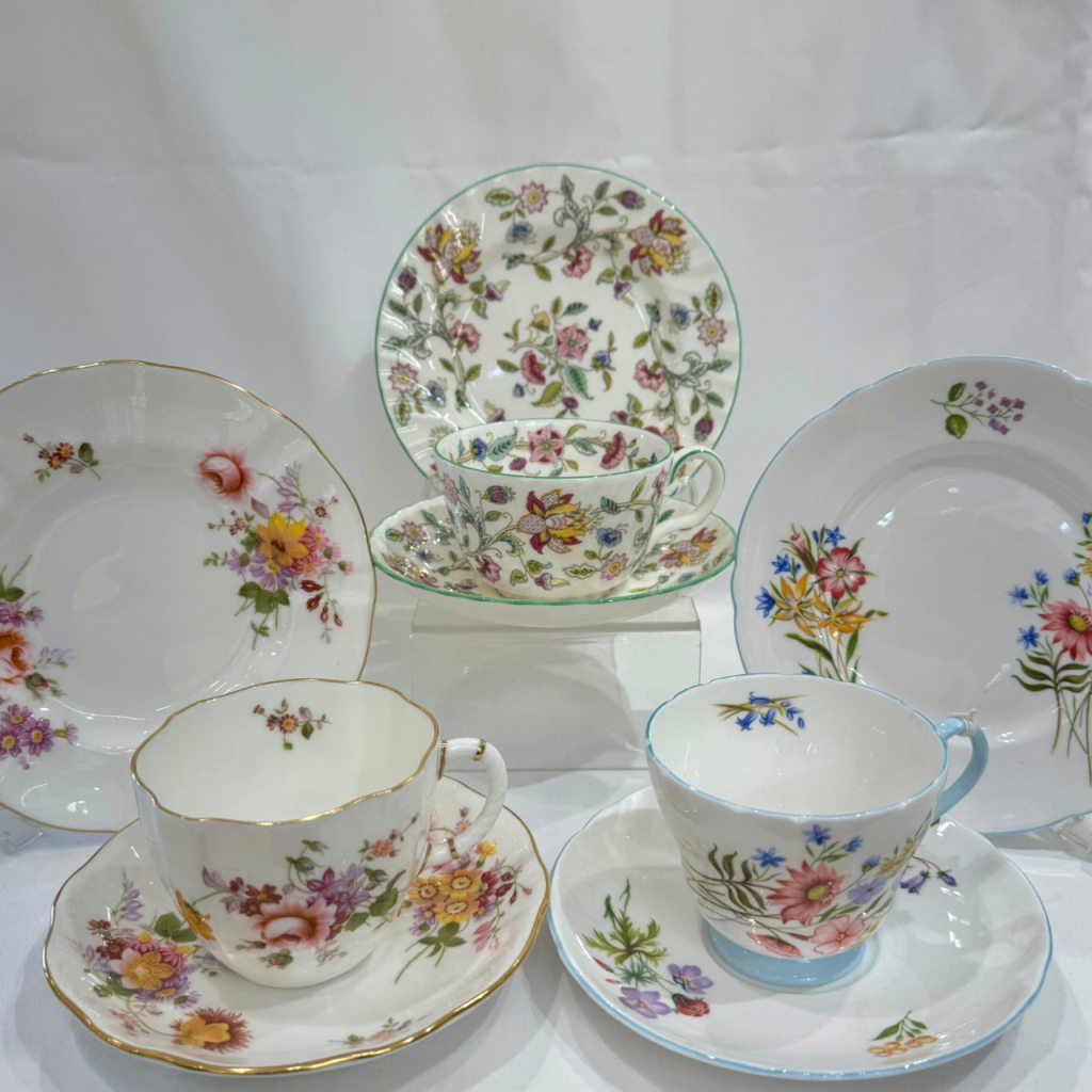 左下:ロイヤルクラウンダービー ダービーポウジーズ トリオセット 税込11,000円 右下:シェリー ワイルドフラワーズ トリオセット 税込19,800円 上:ミントン ハドンホール トリオセット 税込11,000円