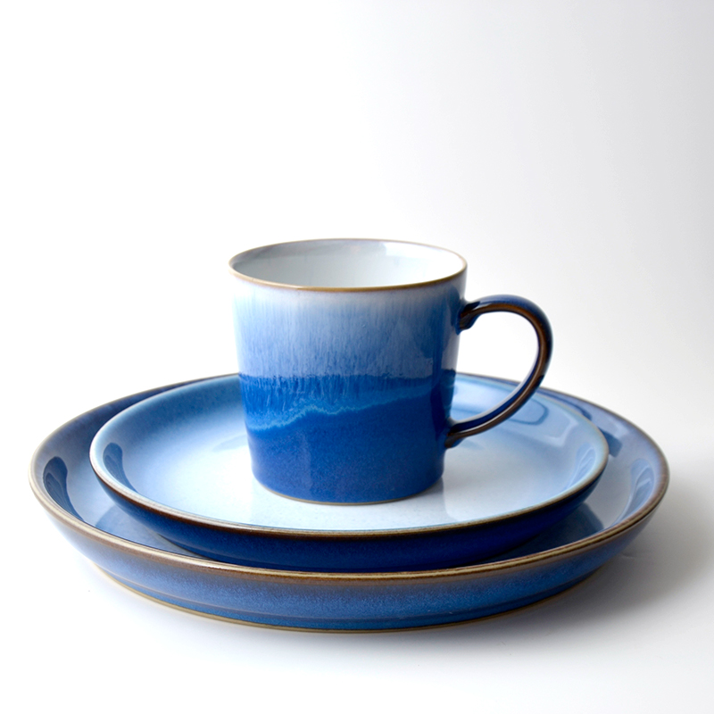 海のようなグラデーションが特徴のマグ。青い釉薬はインペリアルブルーとよく似た色味で合わせても違和感なく使えます。カップ内側は白く、紅茶や緑茶の色味を邪魔しません。