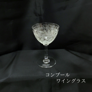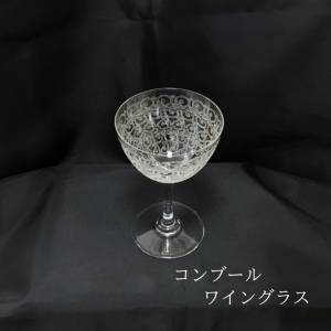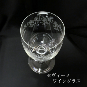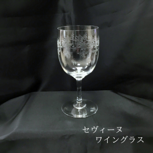 グラスの上部のエッチングが品のあるシンプルな形状のワイングラスです。