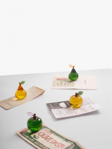 【手前から】フルーツ 9352350 ペーパーウェイト グリーンアップル 税込 2,970円 / フルーツ 9352351 ペーパーウェイト アンバーアップル 税込 2,970円 / 洋ナシ 参考商品