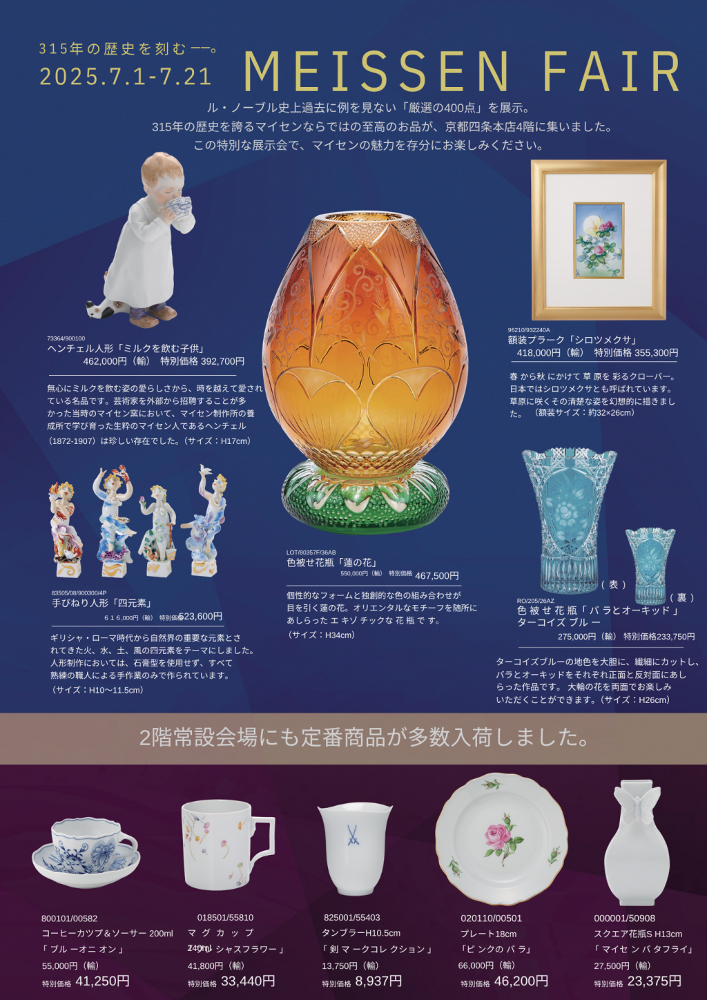 Celebrating over 315 years of craftsmanship, we are excited to host a unique event at Le Noble Kyoto Shijo Main Store during Gion Festival. From July 1st to July 21st, enjoy an exquisite collection of approximately 400 pieces, including world-limited editions, fine tableware, glass art, and paintings — perfect for both collectors and everyday use.
